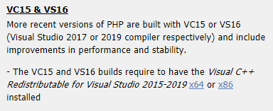 이 문제는 당연하게도 맨 위 홈페이지 캡처에 나타나있듯이 PHP 7.4.x가 Visual C++ 15 (Visual Studio 2017)로 빌드되었기 때문에 실행하기 위해 필요한 환경(런타임)을 갖지 못해 실행할 수 없다는 메시지이다.