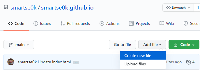 얼른 빠르게 다시 [Code]에서 [Add file] -> [Create new file]을 누른 다음...