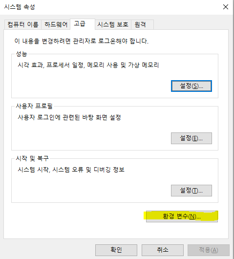 간혹 환경변수 설정 창이 나타나지 않고 시스템 속성 창이 나타나는 경우 아래에 있는 [환경 변수]를 클릭한다.