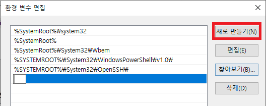환경 변수 편집 창이 나타나면 우측의 [새로 만들기]를 클릭하면 중간의 상자에 새로운 입력 상자가 한 줄 생긴다.