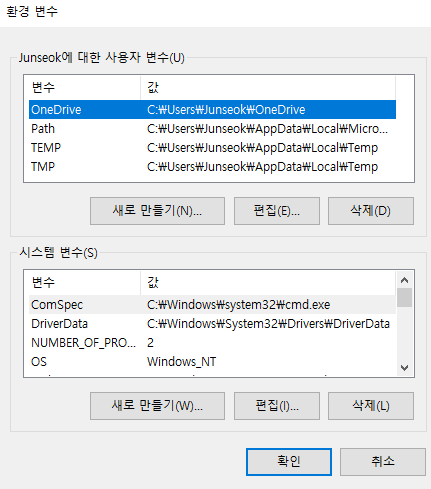 아래쪽(시스템 변수) : 위쪽과 다르게 이곳에서 설정되는 내용은 지금 컴퓨터에 있는 모든 사용자가 공통으로 사용된다. 다른 사용자 계정에서도 사용할 경우엔 이 부분에서 작업하자.