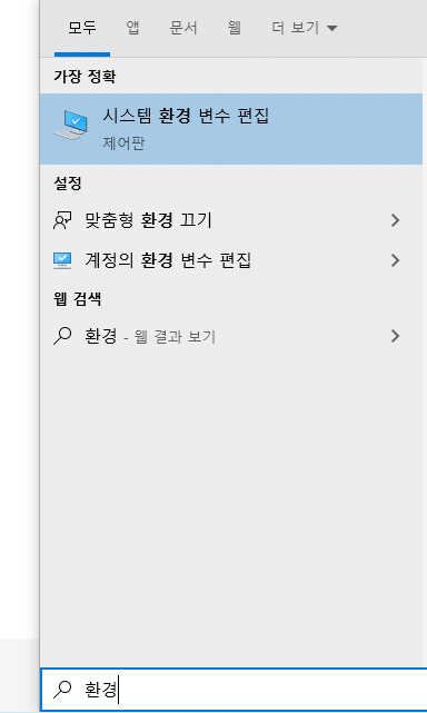 시작 버튼을 누른 다음 "환경"을 입력하고