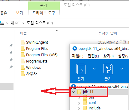 다운로드 받은 OpenJDK 압축 파일을 열고 자신이 원하는 위치에 압축을 푼다.