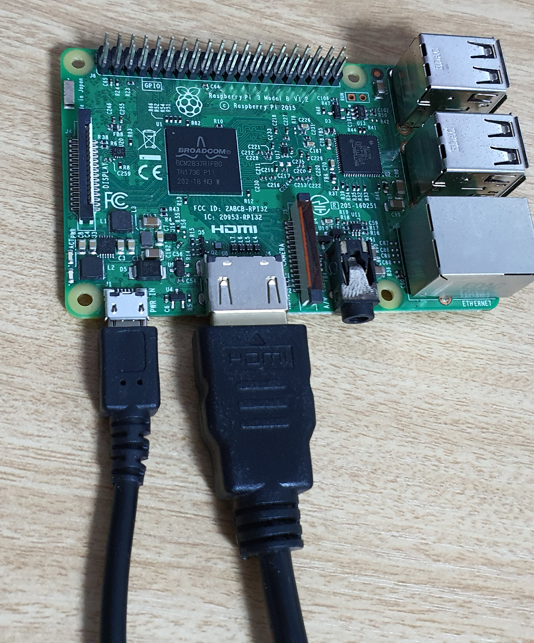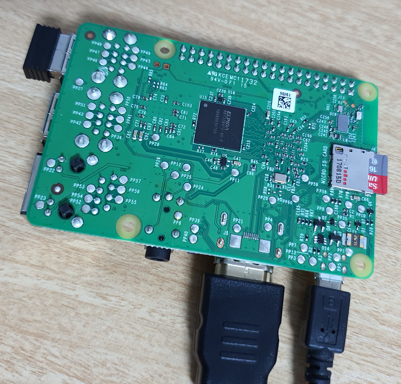 라즈베리파이에 전원, HDMI, USB 키보드/마우스, microSD 카드를 꽂아준다.
