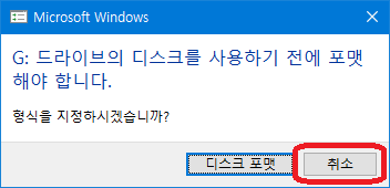 그리고 성공 메시지가 출력됨과 동시에 간혹 윈도우에서 아래 사진과 같이 포맷을 물어보는 화면이 나올 수도 있는데 취소를 눌러야한다.