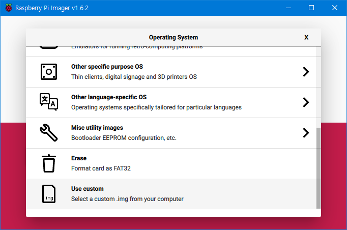 만약 자신이 외부에서 받은 운영체제가 있다면 최하단에 있는 [Use custom]을 눌러 이미지 파일을 직접 선택할 수도 있다.